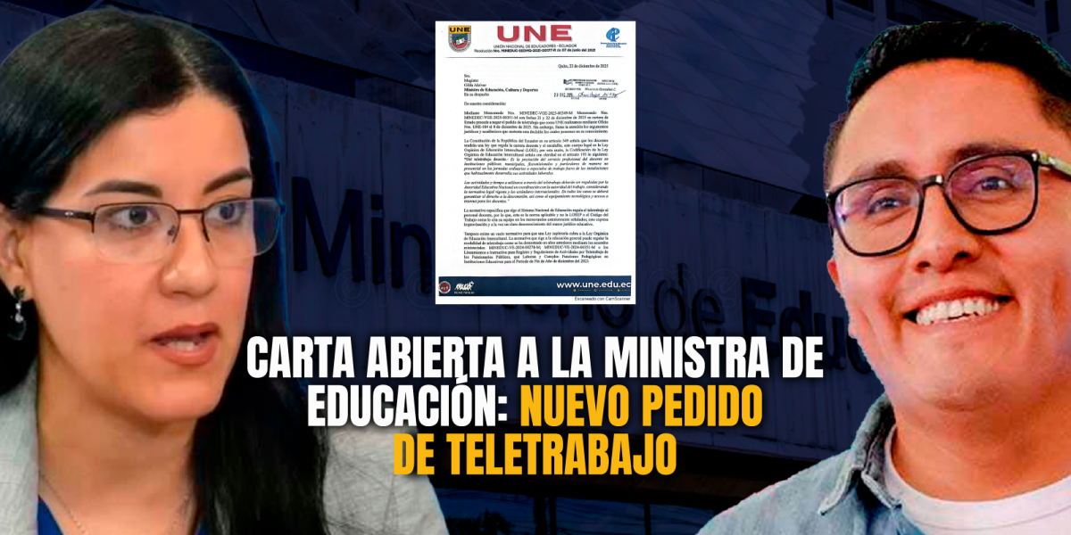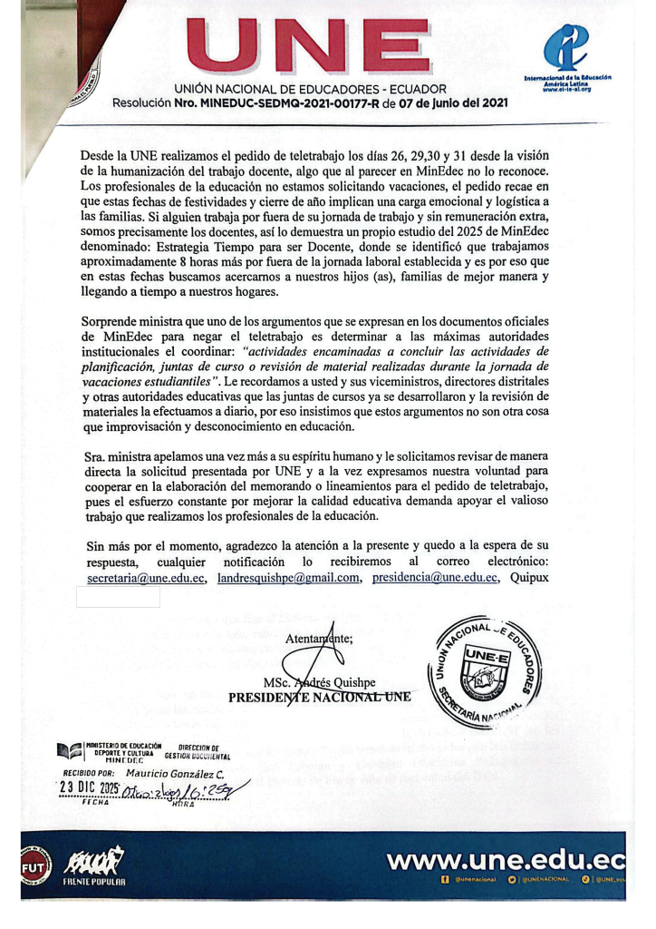 Mediante Memorando Nro. MINEDEC-VGE-2025-00349-M Memorando Nro. MINEDEC-VGE-2025-00351-M con fechas 21 y 22 de diciembre de 2025 su cartera de Estado procede a negar el pedido de teletrabajo que como UNE realizamos mediante Oficio Nro. UNE-184 el 8 de diciembre de 2025. Sin embargo, llama la atención los argumentos jurídicos y académicos que sustenta esta decisión los cuales ponemos en su conocimiento.